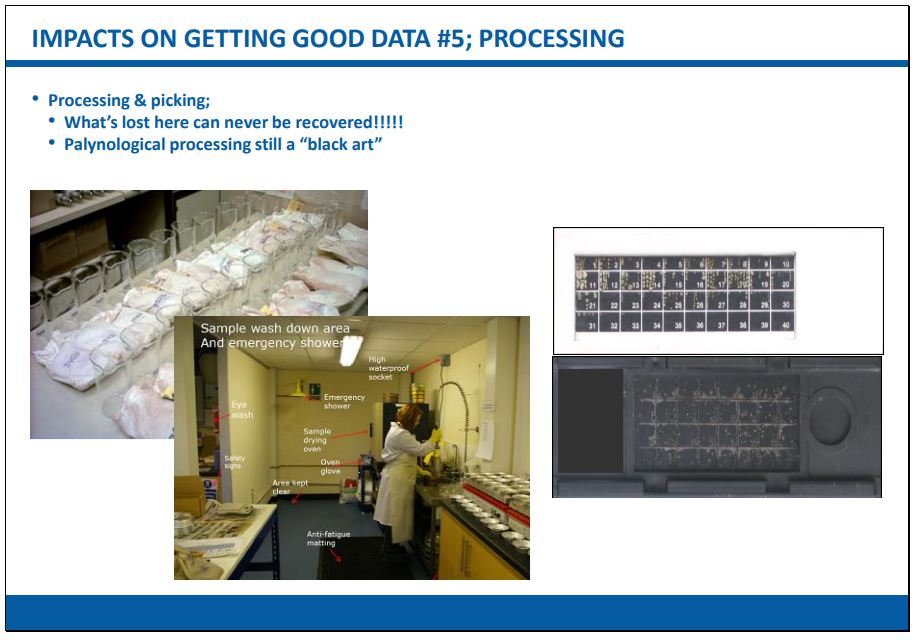 All studies in biostratigraphy, no matter the reason, require rock samples from which to obtain the fossils. Some fossils are found whole in the rocks and can be extracted in one piece (hopefully). Microscopic fossils however - those used most often in applied biostratigraphy - require to be “liberated” from the surrounding sediments in one way or another and concentrated to make it convenient for the analyst to examine as many specimens as possible. It is important that biostratigraphers have a good degree of control over their samples in that they need to know (a) from where exactly the sample was obtained and (b) that the sample is not contaminated with material that has come from anywhere else. This control is often easy to deliver when sampling outcrops at the surface or near surface but much less so when dealing with samples that are obtained by drilling. The drilling process imparts many variables and unknowns into sample generation and collection and anyone who relies on data of any kind from these samples must be aware of such uncertainties.